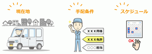 作業者が位置情報サービスをオンにしている場合、現場までの距離を条件指定することにより、より早く現場に行ける人を手配することができます。