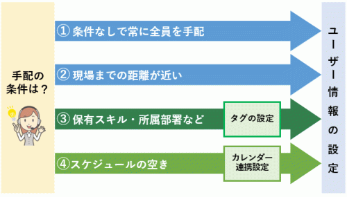 ③を手配条件に含める場合は、タグ設定を行ってからそのタグをユーザーに付与する必要があります。