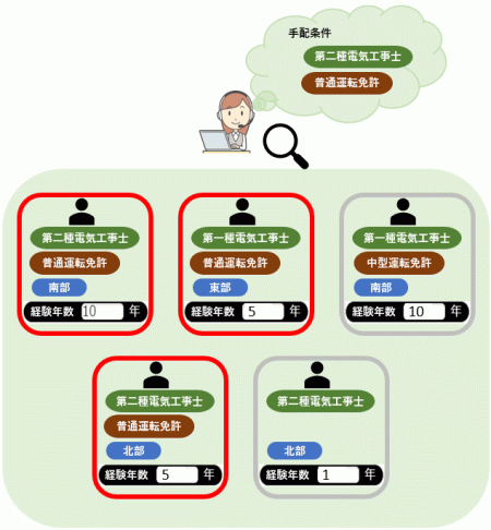 手配候補者を検索する際にタグを使用します。手配される側のユーザーにはあらかじめ保有スキルや所属などの必要情報をタグとして設定しておきます。