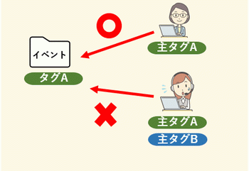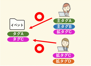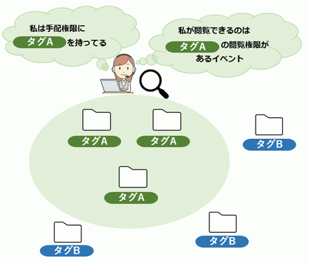 閲覧権限にタグを設定した場合、イベントを閲覧できるのは手配権限で「主権限」または「拡張権限」にタグを持っている人です。具体的な例を以下に示します。