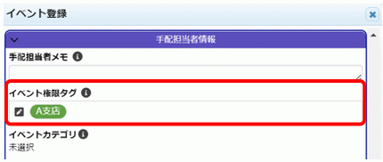 閲覧権限は手配権限と対応しているため、新規イベント登録ウィンドウの[イベント権限タグ]には、その人が手配権限で持っているタグが自動的に設定されます。