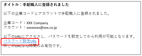 パスワードを設定するためのURLは72時間のみ有効です。メール受信後、期限内にパスワードを設定してください。