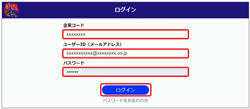 2.ログイン画面に、通知メールに記載されている「企業コード」、「ログインID(メールアドレス)」、と自分で設定したパスワードを入力します。