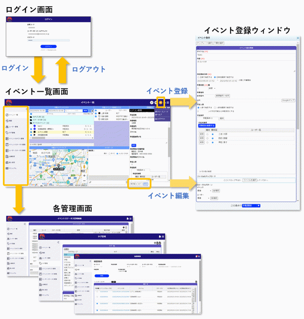 ※手配権限がないユーザーがログインすると、イベント一覧画面は表示されず、履歴画面が表示されます。履歴画面で自分が手配されたイベントだけを閲覧することができます。