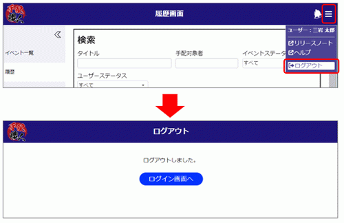 ログアウトする場合は、各画面の右上に表示されているメニューから[ログアウト]をクリックします。