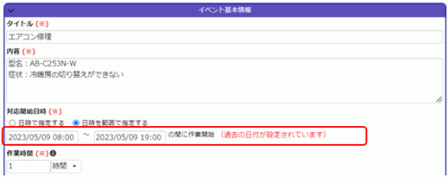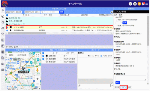 ホーム 4 手配イベントを登録する 4.3 既存イベントを利用して手配する 4.3既存イベントを利用して手配する ↑ 4.3.1似ているイベントをコピーして使う イベント一覧で、コピーしたいイベントを選択し、「詳細表示」の[コピー]ボタンをクリックします。 イベント登録ウィンドウにコピーしたイベントの内容が表示されるので、必要箇所を変更して使用します。特に対応開始日時は、新しいイベントに合わせて修正してください。 ↑