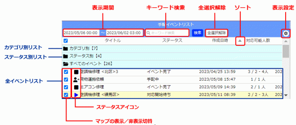 手配イベントリストに表示されるステータスをイベントステータスといいます。このステータスはイベントの進行状況に合わせて変化していきます。各ステータスの意味は下表のとおりです。