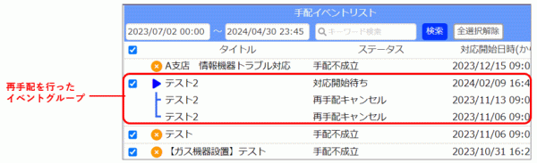 再手配を行ったイベントグループのステータスアイコンをクリックすると、これまで に実行したイベントが表示されます。