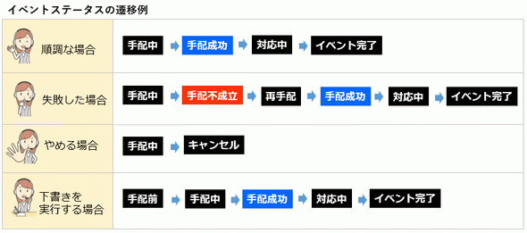 イベントが順調に進む場合、ステータスは[手配中]⇒[手配成功]⇒[イベント完了]と遷移します。