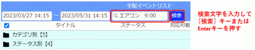 検索文字の入力エリアにキーワードを文字を入力し、Enterキーを押すか[検索]ボタンをクリックします。表示期間内のイベントについて検索され、表示項目に該当文字があったイベントがリストに表示されます。