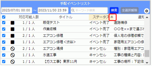 手配イベントリストの通常の並びは、手配作成日の新しい順です。この並びを、列を指定してその列の昇順または降順に並び替えることができます。