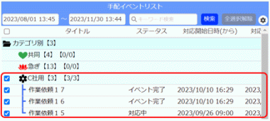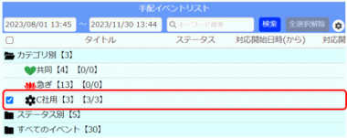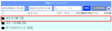 手配イベントリスト上部にある[カテゴリ別]を開くと、イベント登録時にカテゴリを設定している場合、カテゴリ別にイベントを表示できます。