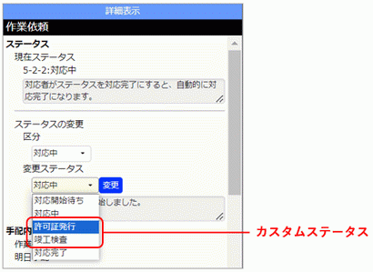 手配職人では標準のステータスに加えて独自のステータスを追加することが可能です。追加したステータスもプルダウンリストから選べるようになります。カスタムステータスの追加については「11 イベントステータスを管理する」を参照してください。