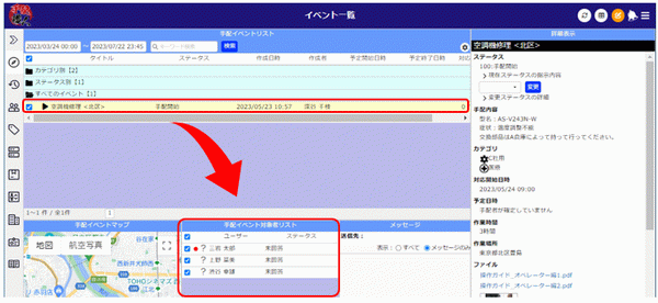 3. イベントをクリックすると、[対象者リスト]が表示され、メッセージを送信したユーザーに赤丸が表示されています。