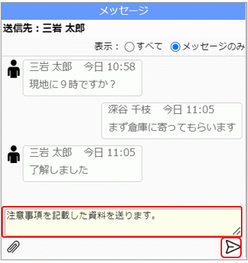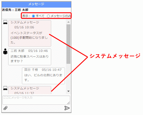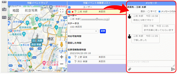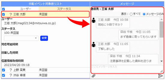 [メッセージ]には、[手配イベント対象者リスト]で選択しているユーザーとのメッセージが表示されます。ユーザー名が表示されるので、相手を確認してメッセージの送受信を行ってください。