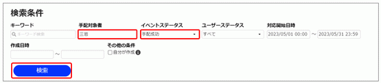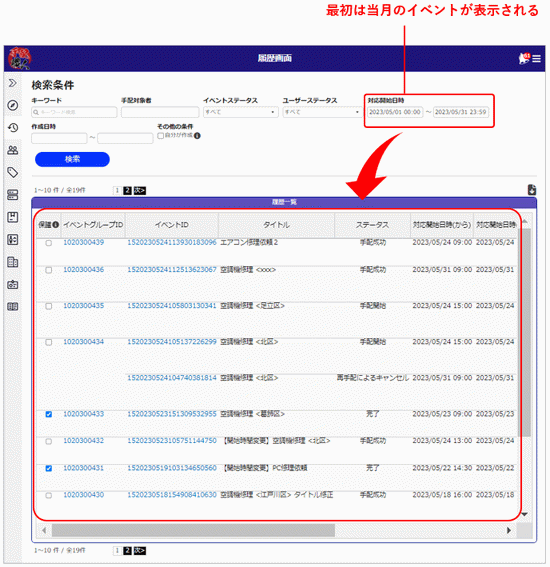 履歴画面を開くと、最初は履歴一覧に「対応開始日時」が当月分のイベントが表示されます。表示範囲を変えたい場合は、「対応開始日時」を変更してください。