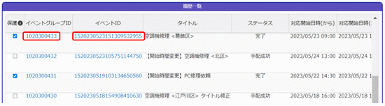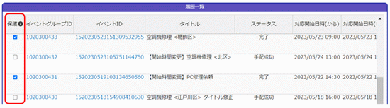 イベントグループは対応済みステータス(完了やキャンセル)になってから15か月で自動的に削除されます。削除したくないイベントグループは[保護]チェックボックスをオンにしておくと保護することができます。