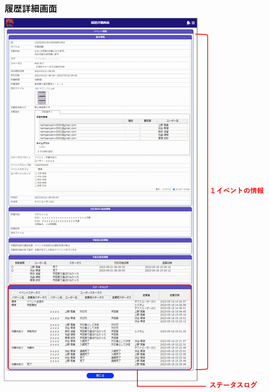「ステータスログ」では、各ステータスに遷移した時間を確認することができます。