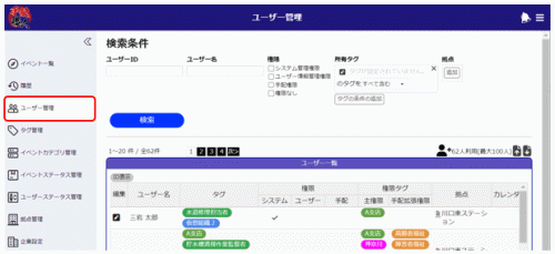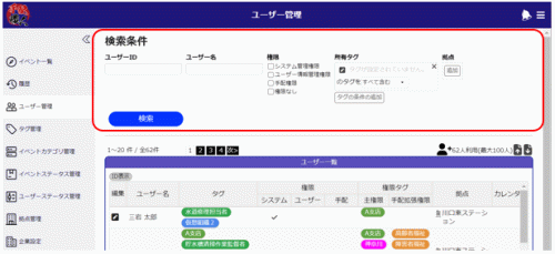 [ユーザーID]、[ユーザー名]、[権限]、[所有タグ]、[拠点]を条件にしてユーザーを検索することができます。