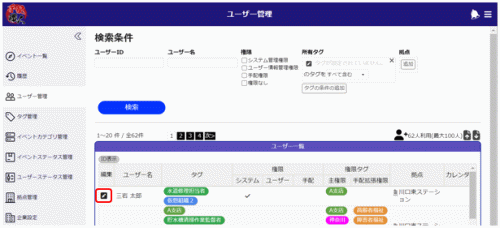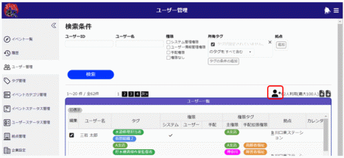 メニューの[ユーザー管理]を選択すると、登録しているユーザーの一覧と各ユーザーが所有しているタグや権限などが表示されます。