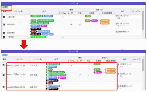 ユーザー一覧の左上にある[ID表示]ボタンをクリックすると、ユーザーID(メールアドレス)が表示されます。また、各タグにはタグIDが表示されます。タグIDはAPI連携する際に使用します。