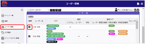 1.メニューから[ユーザー管理]を選び、ユーザー一覧で編集したいユーザーの