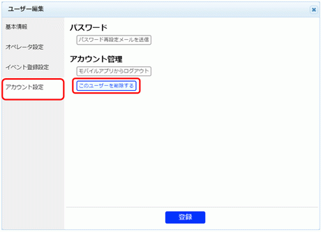 ユーザーを削除できるのは、システム管理者とユーザー情報管理者です。ユーザー情報管理者は自分に権限のあるユーザーに対してのみ操作が可能です。また、ログインしている本人の削除はできません。