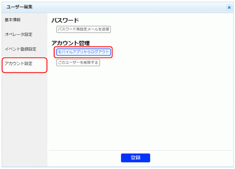 ※自分をモバイルアプリからログアウトさせる場合は、メニューの[個人設定]から操作することができます。(上記権限のないユーザーも可能)