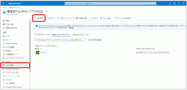 3.[アプリの登録]を開き、「+新規作成」をクリックします。
