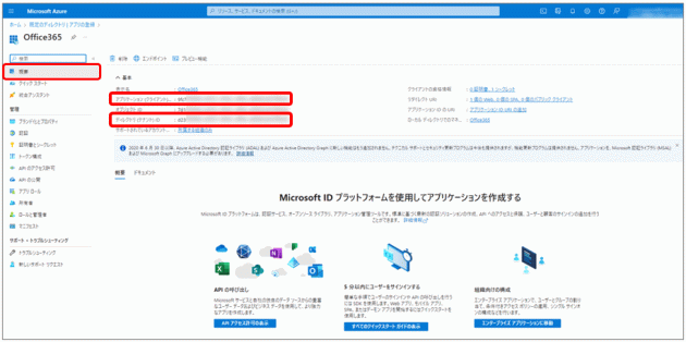 5.作成したアプリを開き、「クライアントID」と「テナントID」を、それぞれtenant_id、client_idとして控えておきます。