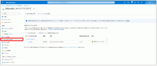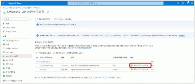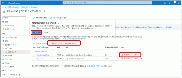 ※「状態」に「!」が表示されている時は、「既存のディレクトリに管理者の同意を与えます」をクリックし、内容を確認して「はい」をクリックします。