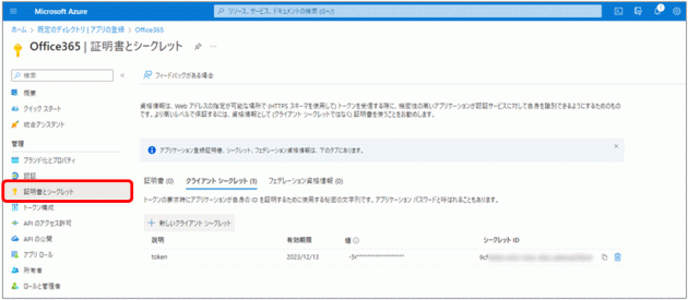 ※作成されたクライアントシークレットの値は後から確認・変更することはできません。必ず作成した瞬間に値を退避しておいてください。