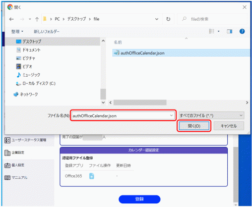 4.作成しておいたauthOfficeCalendar.jsonを選択してアップロードします。