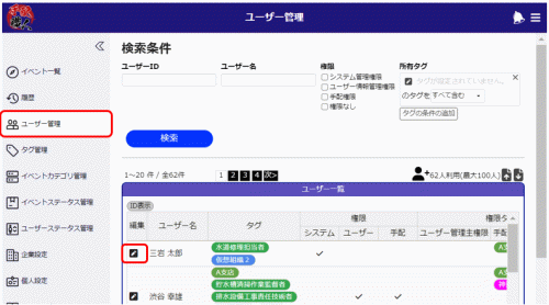 1.手配職人のユーザー管理画面を表示して、カレンダー連携するユーザーを選択します。