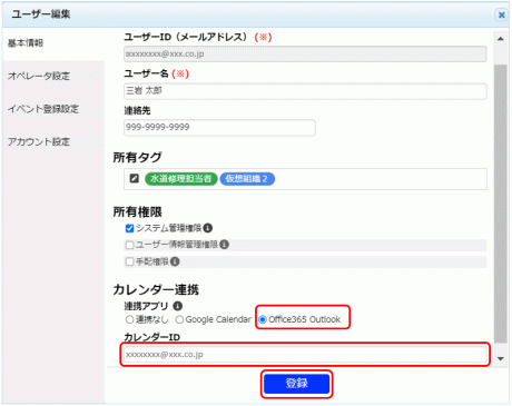 2.[カレンダー連携]で「Office365 Outlook」のラジオボタンを選択し、[カレンダーID]にユーザーのメールアドレスを設定します。