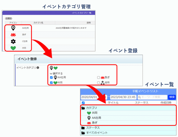 イベントカテゴリは手配権限のある人が自由に登録でき、登録済みのカテゴリは自分以外の人が作成したものも使用することができます。