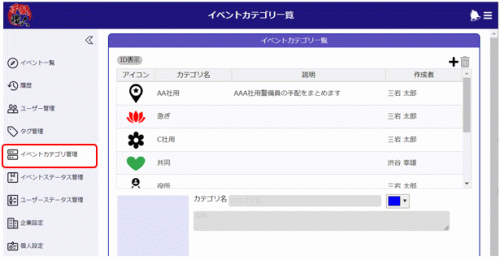 イベントカテゴリ管理面面は、メニューの[イベントカテゴリ管理]を選択すると表示できます。
