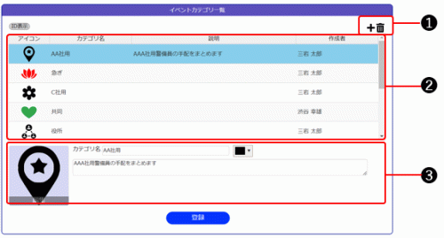 この画面でカテゴリ名やアイコンを登録します。この画面に設定されているカテゴリがイベント登録ウィンドウで選択できるようになります。