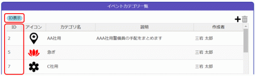 [ID表示]ボタンをクリックすると、内部で持っているイベントカテゴリのIDが表示されます。