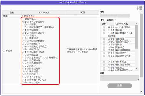 複数のイベントステータスパターンを設定しておくと、イベント登録時にその中からイベントに合ったパターンを選択することができます。