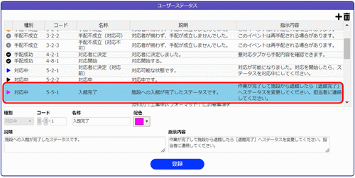 1.編集するステータスの行を選択し、「種別」、「コード」、「名称」、「配色」、「説明」、「指示内容」の必要な項目を編集します。