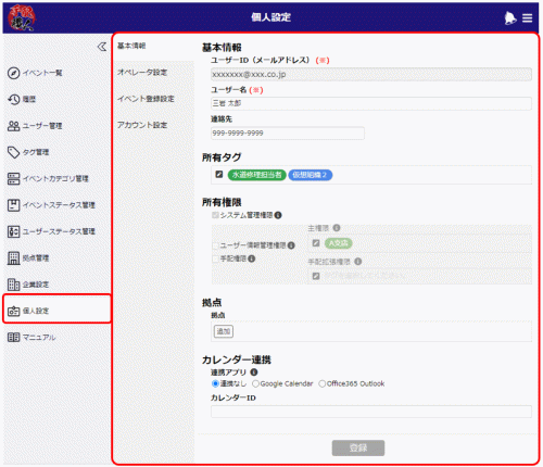 個人設定では、現在ログインしているユーザーが自分の情報を編集することができます。