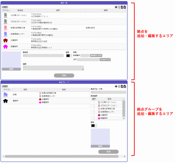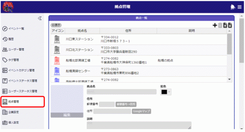 [拠点一覧]:拠点の追加・編集・削除を行います。