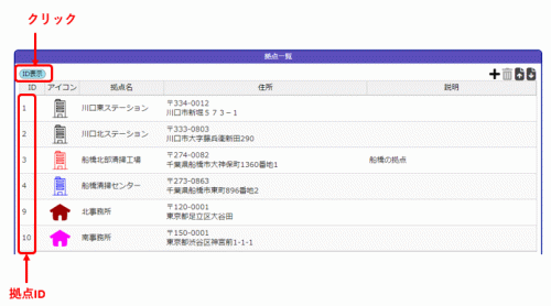 リストの上にある[ID表示]ボタンをクリックすると、システム内部で持っている拠点のIDが表示されます。拠点情報をCSVファイルに保存すると、IDも出力されています。