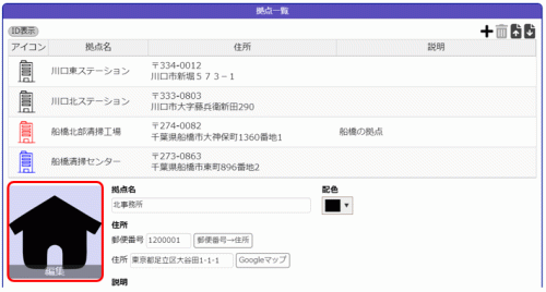 「配色」はこの拠点を示す地図上のアイコンの色になります。
