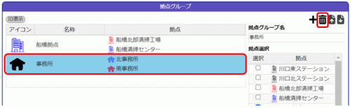 ホーム 14 拠点を管理する 14.8 拠点グループを削除する 14.8拠点グループを削除する ※システム管理者以外は、他の人が作成した拠点グループを削除することはできません。 1.削除する拠点グループを選択し、をクリックします。 一覧から拠点グループが削除されます。 ↑