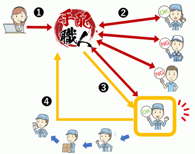 ❷:手配職人が、候補者に一斉通知します。候補者は対応可否、対応可能時間を返答します。