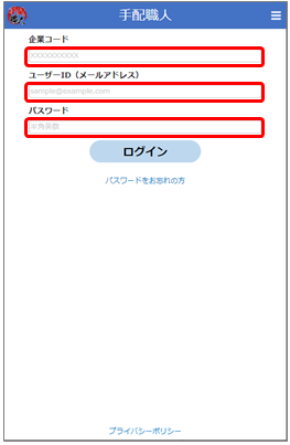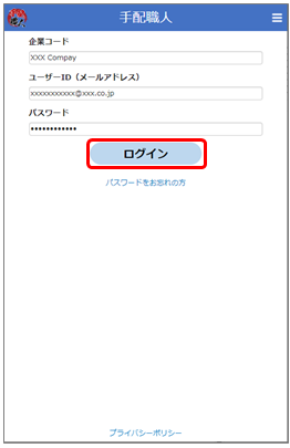 1.「手配職人に登録されました」というメールに記載されている企業コード、ログインIDと、自分で設定したパスワードを入力します。