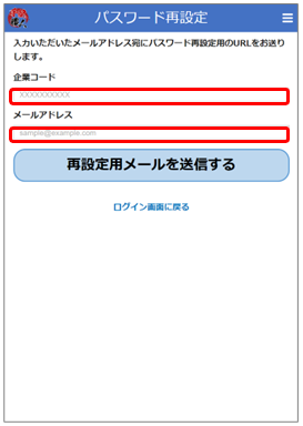 パスワード再設定画面で[企業コード]と[メールアドレス]を入力して[再設定用メールを送信する]ボタンをタップします。メールが届いたら、72時間以内にパスワードの設定を行ってください。