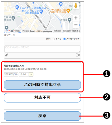 対応可能日時は、[対応予定日時の入力]に表示されている日時の範囲で回答が可能です。